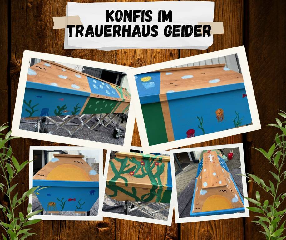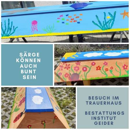 Eine fröhliche Auseinandersetzung mit dem Tod ist immer wieder die Gestaltung eines Sargs. Das Bestattungsunternehmen Geider lässt den Erlös des bemalten Sargs einem guten Zweck zukommen. Herzlichen Dank für die Zeit und Möglichkeit, das Trauerhaus mit den Jugendlichen besichtigen zu können.